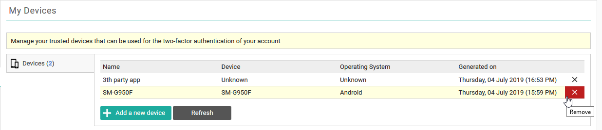To unlink a device, click the X icon at the end of the related entry.