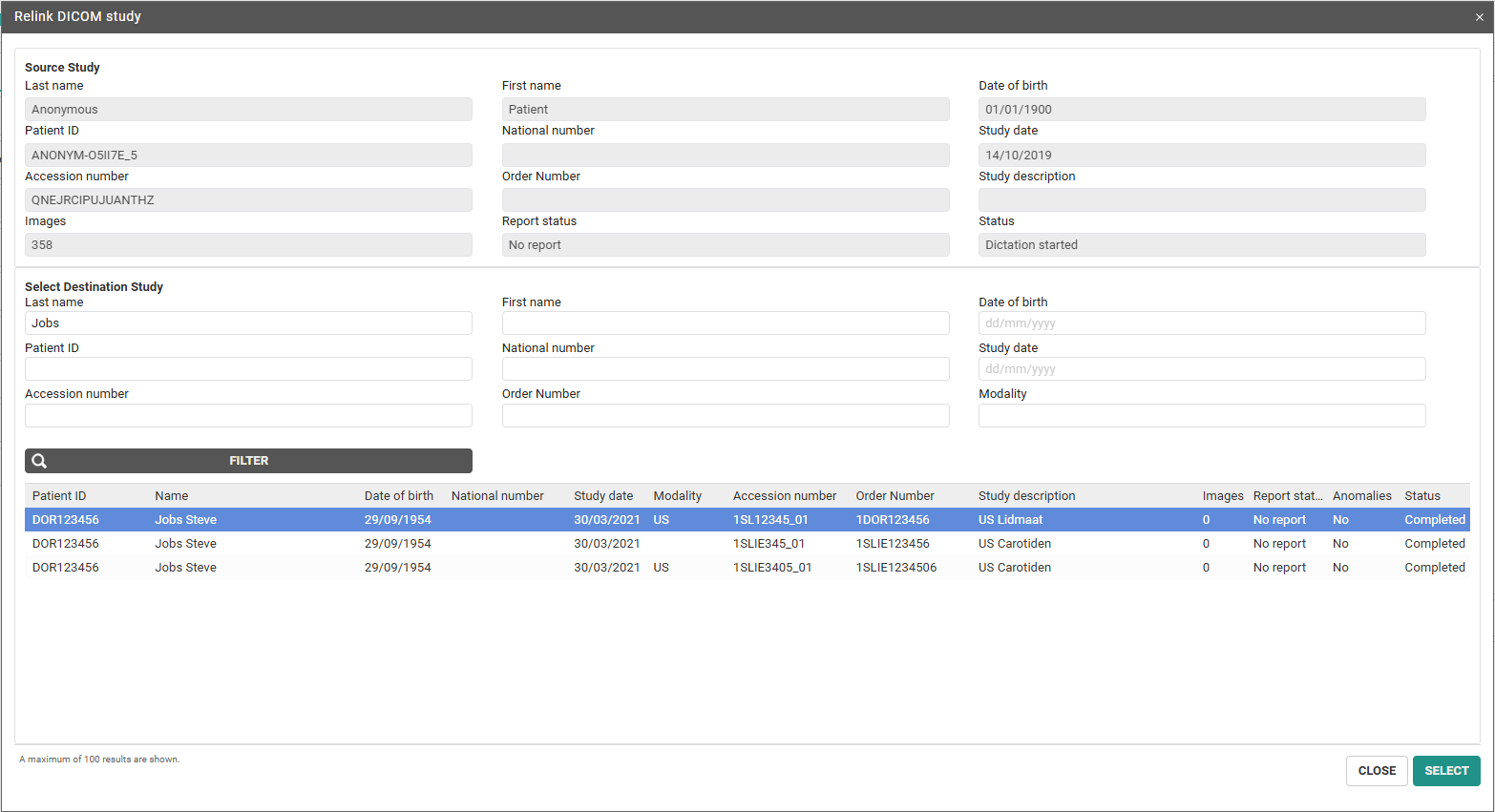 ◦ To look up the correct study, select the study from the list and click the Select button.