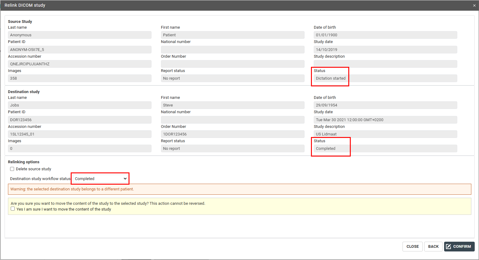 ◦ If the source does allow it, you receive a warning where you have to confirm before you are able to continue and merge the studies.